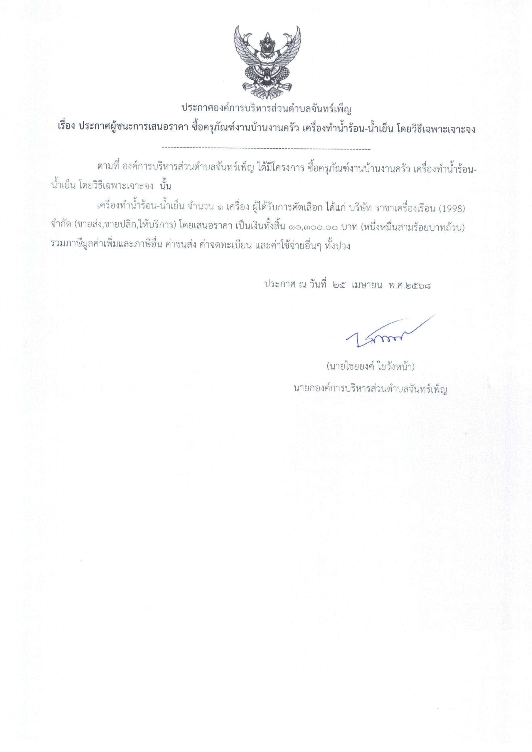 ประกาศ อบต.จันทร์เพ็ญ เรื่อง ประกาศผู้ชนะการเสนอราคา ซื้อครุภัณฑ์งานบ้านงานครัว เครื่องทำน้ำร้อน – น้ำเย็น 25 เมษายน 6823 มิถุนายน 25อบต. จันทร์เพ็ญประกาศ/ระเบียบ/ดาวน์โหลด อ่านแล้ว : 65 Facebook iconFacebookTwitter iconTwitterLINE iconLine