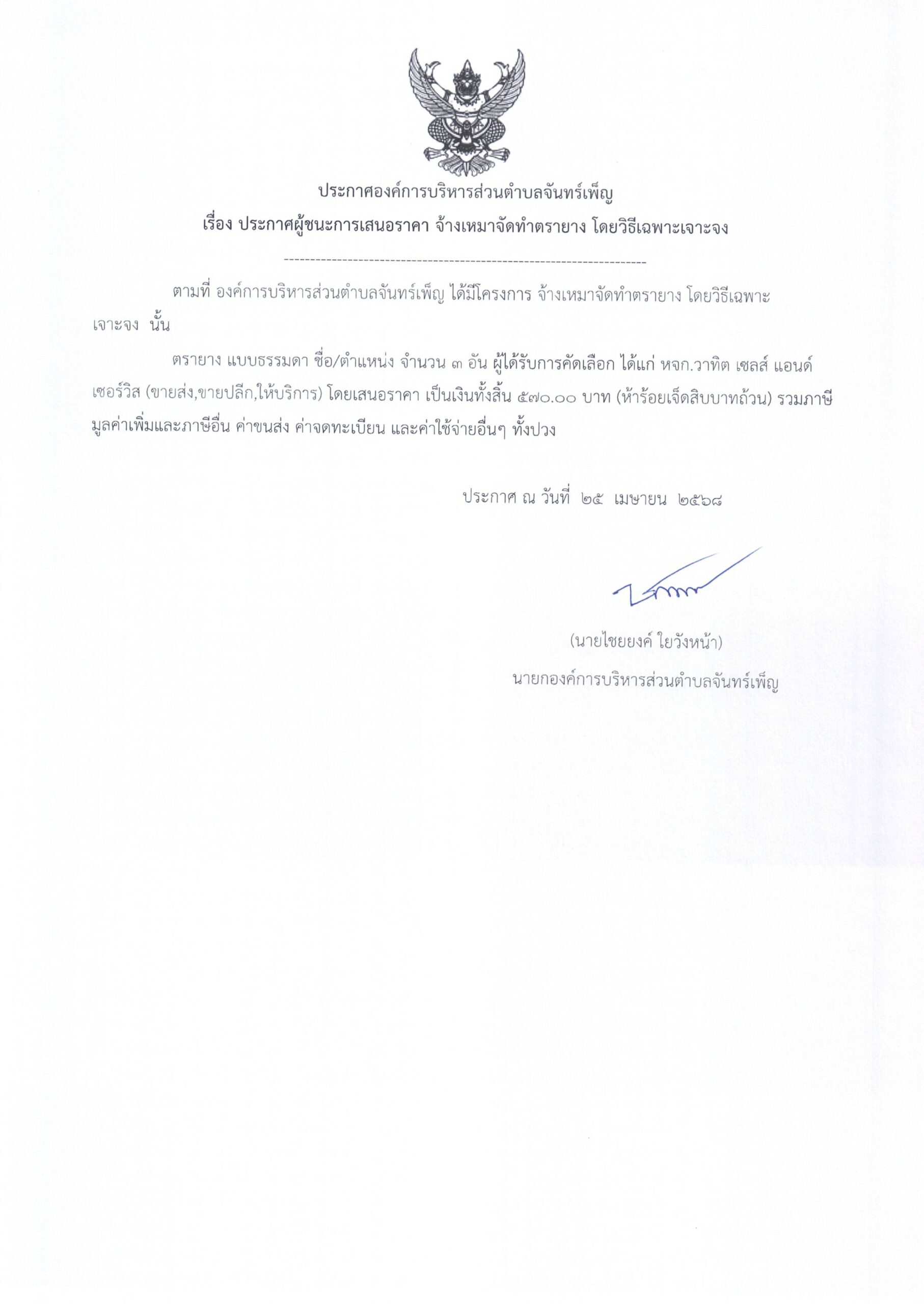 ประกาศ อบต.จันทร์เพ็ญ เรื่อง ประกาศผู้ชนะการเสนอราคา จ้างเหมาจัดตรายาง 23 มิถุนายน 68อบต. จันทร์เพ็ญประกาศ/ระเบียบ/ดาวน์โหลด อ่านแล้ว : 496 Facebook iconFacebookTwitter iconTwitterLINE iconLine