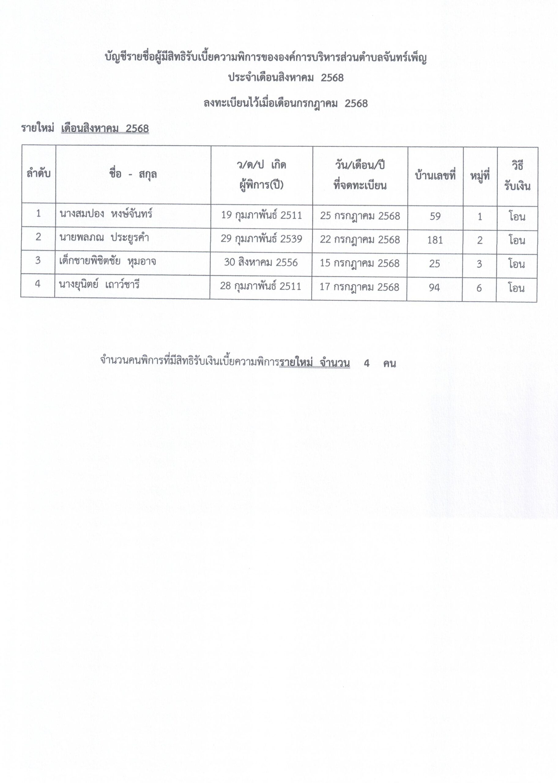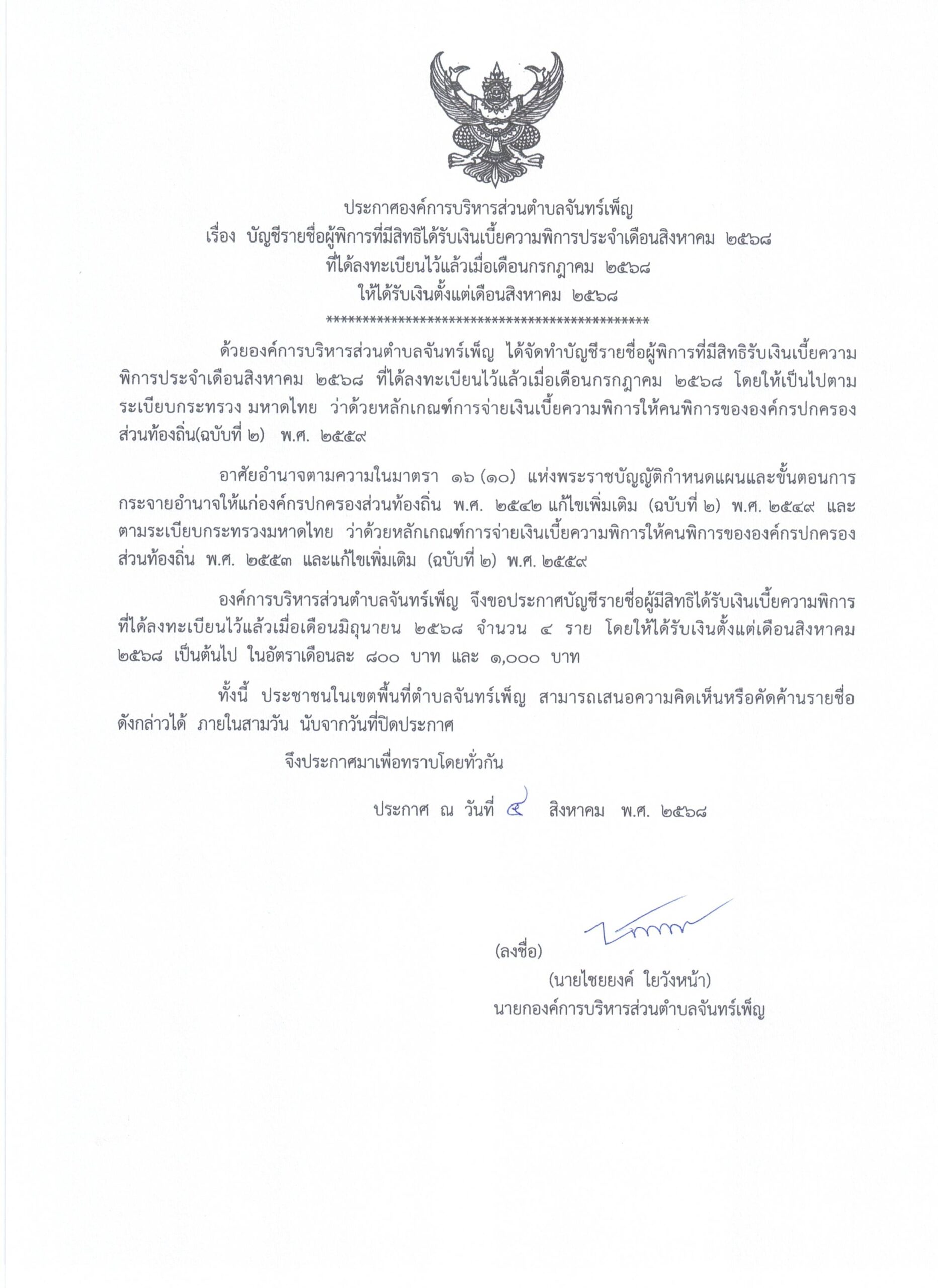ประกาศ อบต.จันทร์เพ็ญ บัเรื่องรายชื่อผู้พิการที่มีสิทธิได้รับเงินเบี้ยความพิการประจำเดือนสิงหาคม 2568 ที่ได้ลงทะเบียนไว้แล้วเมื่อเดือนกรกฎาคม 2568 ให้ได้รับเงินตั้งแต่เดือน สิงหาคม 2568 5 สิงหาคม 6814 สิงหาคม 25อบต. จันทร์เพ็ญข่าวประชาสัมพันธ์, ประกาศ/ระเบียบ/ดาวน์โหลด อ่านแล้ว : 82 Facebook iconFacebookTwitter iconTwitterLINE iconLine