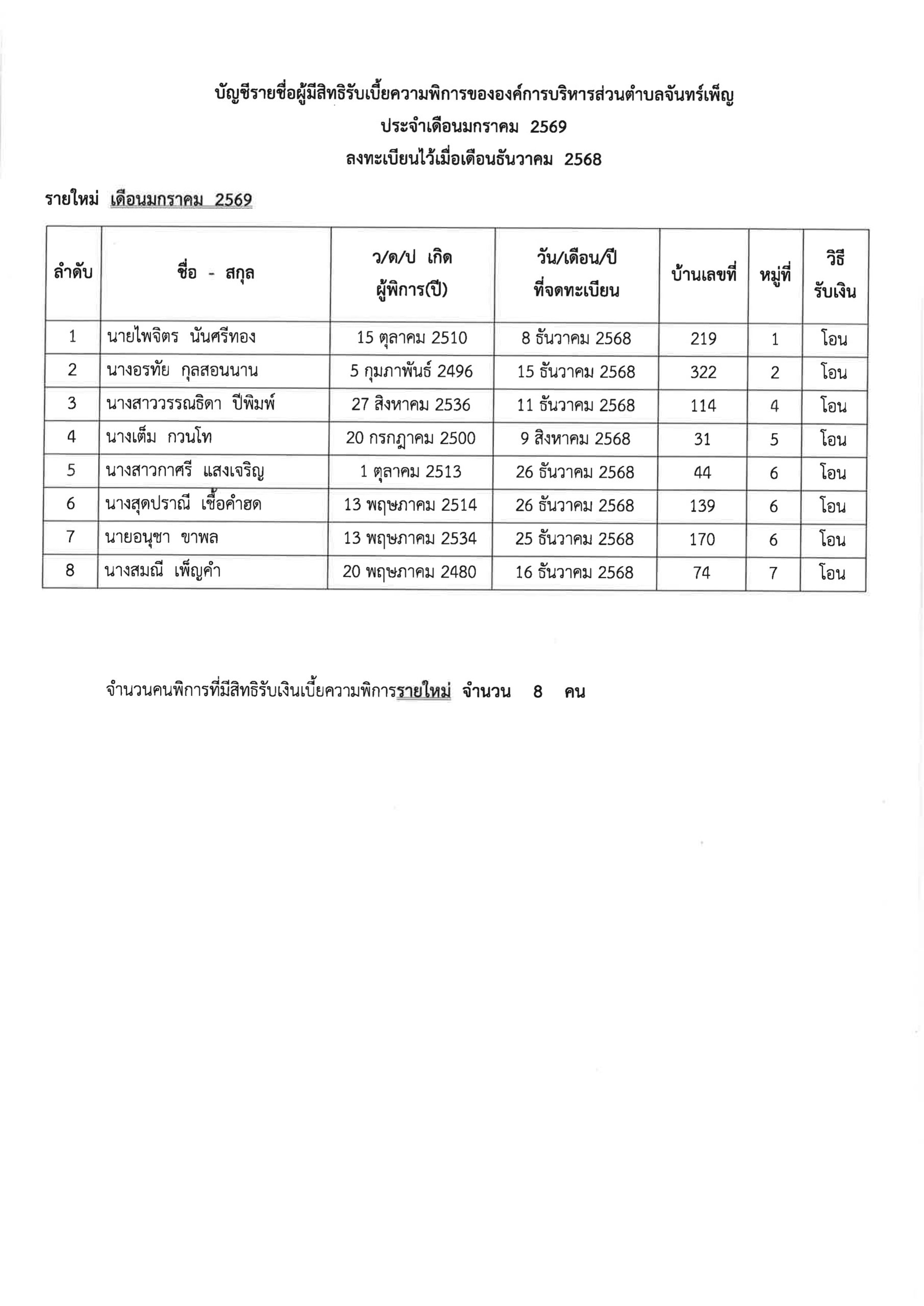 ประกาศ อบต.จันทร์เพ็ญ เรื่อง บัญชีรายชื่อผู้พิการที่มีสิทธิได้รับเงินเบี้ยความพิการประจำเดือนมกราคม 2569 ที่ได้ลงทะเบียนไว้แล้วเมื่อเดือนธันวาคม 2568 ให้ได้รับเงินตั้งแต่เดือนมกราคม 2569 6 มกราคม 696 มกราคม 26อบต. จันทร์เพ็ญข่าวประชาสัมพันธ์ อ่านแล้ว : 53 Facebook iconFacebookTwitter iconTwitterLINE iconLine