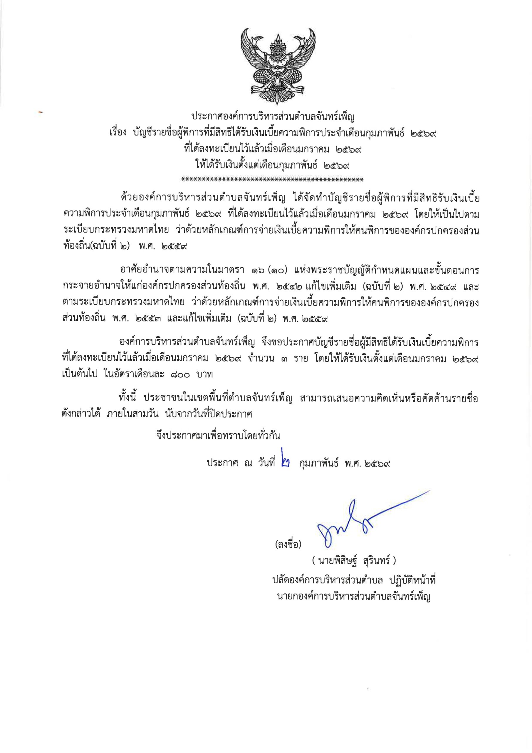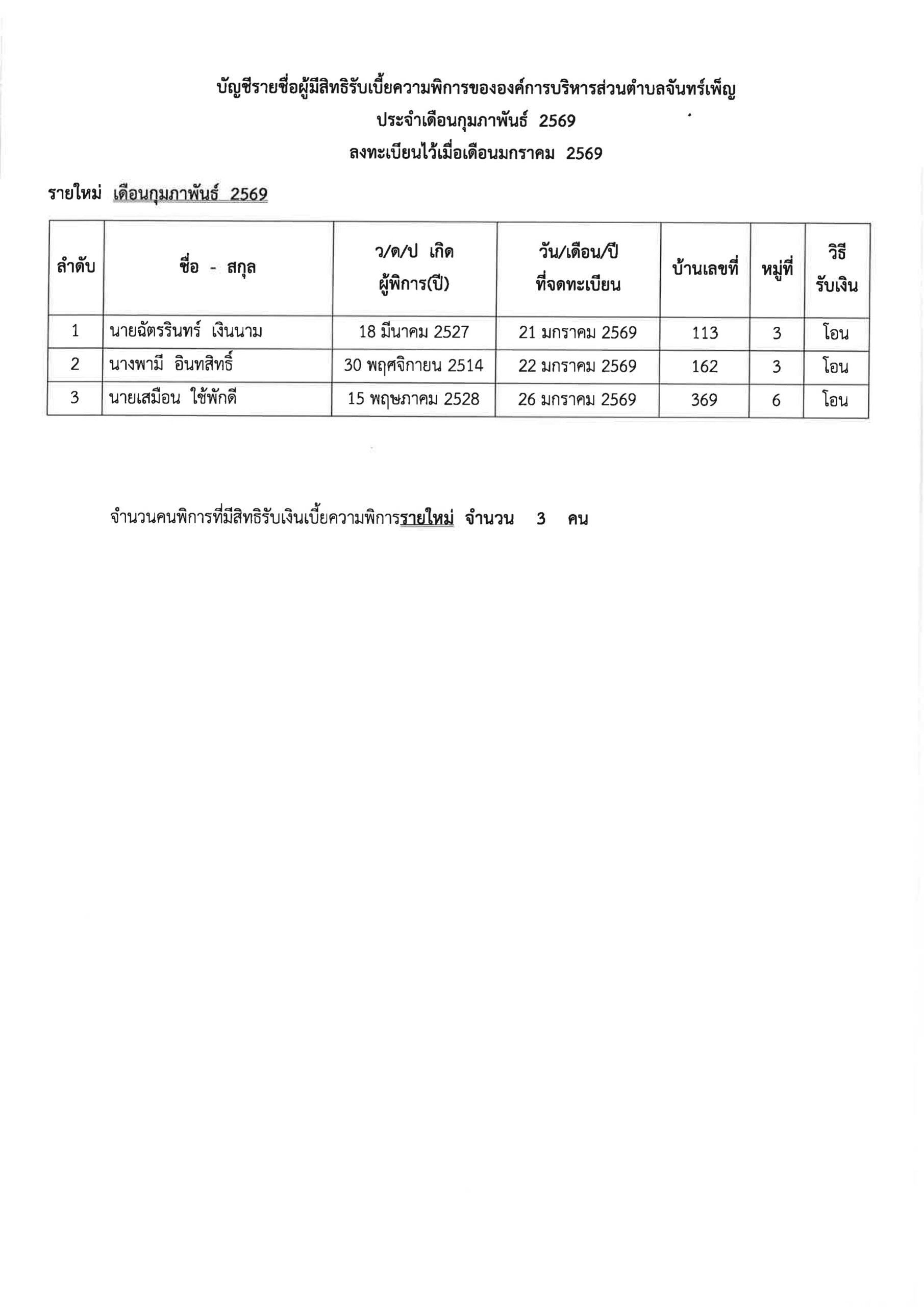 ประกาศ อบต.จันทร์เพ็ญ เรื่อง บัญชีรายชื่อผู้พิการที่มีสิทธิได้รับเงินเบี้ยความพิการประจำเดือนกุมภาพันธ์ 2569 ที่ได้ลงทะเบียนไว้แล้วเมื่อเดือนมกราคม 2569 ให้ได้รับเงินตั้งแต่เดือนกุมภาพันธ์ 2569 3 กุมภาพันธ์ 69อบต. จันทร์เพ็ญข่าวประชาสัมพันธ์ อ่านแล้ว : 32 Facebook iconFacebookTwitter iconTwitterLINE iconLine
