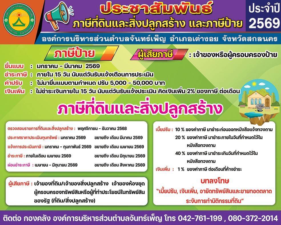 ประชาสัมพันธ์การจัดเก็บภาษ๊ที่ดินและสิ่งปลูกสร้าง ประจำปี 2569 2 เมษายน 69อบต. จันทร์เพ็ญข่าวประชาสัมพันธ์ อ่านแล้ว : 35 Facebook iconFacebookTwitter iconTwitterLINE iconLine