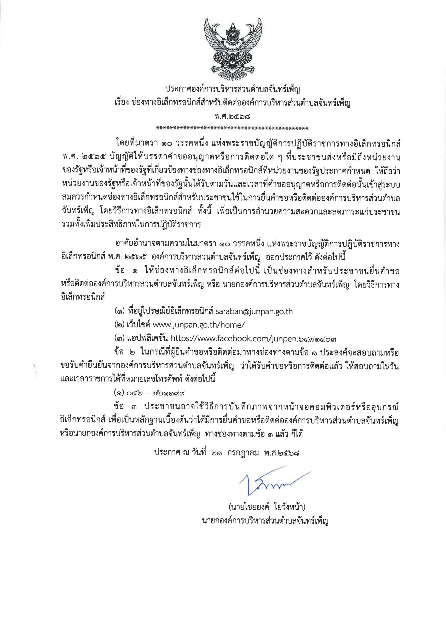 ประกาศองค์การบริหารส่วนตำบลจันทร์เพ็ญ เรื่อง ช่องทางอิเล็กทรอนิกส์สำหรับติดต่อองค์การบริหารส่วนตำบลจันทร์เพ็ญ พ.ศ.2568 22 กรกฎาคม 6829 เมษายน 26อบต. จันทร์เพ็ญข่าวประชาสัมพันธ์, ประกาศ/ระเบียบ/ดาวน์โหลด อ่านแล้ว : 8 Facebook iconFacebookTwitter iconTwitterLINE iconLine