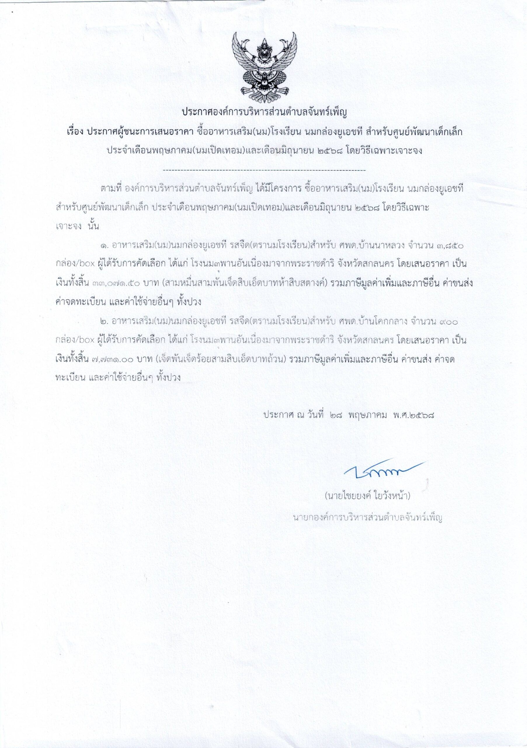 ประกาศ อบต.จันทร์เพ็ญ เรื่อง ประกาศผู้ชนะการเสนอราคา ซื้อนมอาหาร (นม) โรงเรียน นมยูเอชที 28 พฤษภาคม 6817 พฤศจิกายน 25อบต. จันทร์เพ็ญประกาศจัดซื้อจัดจ้าง อ่านแล้ว : 6 Facebook iconFacebookTwitter iconTwitterLINE iconLine