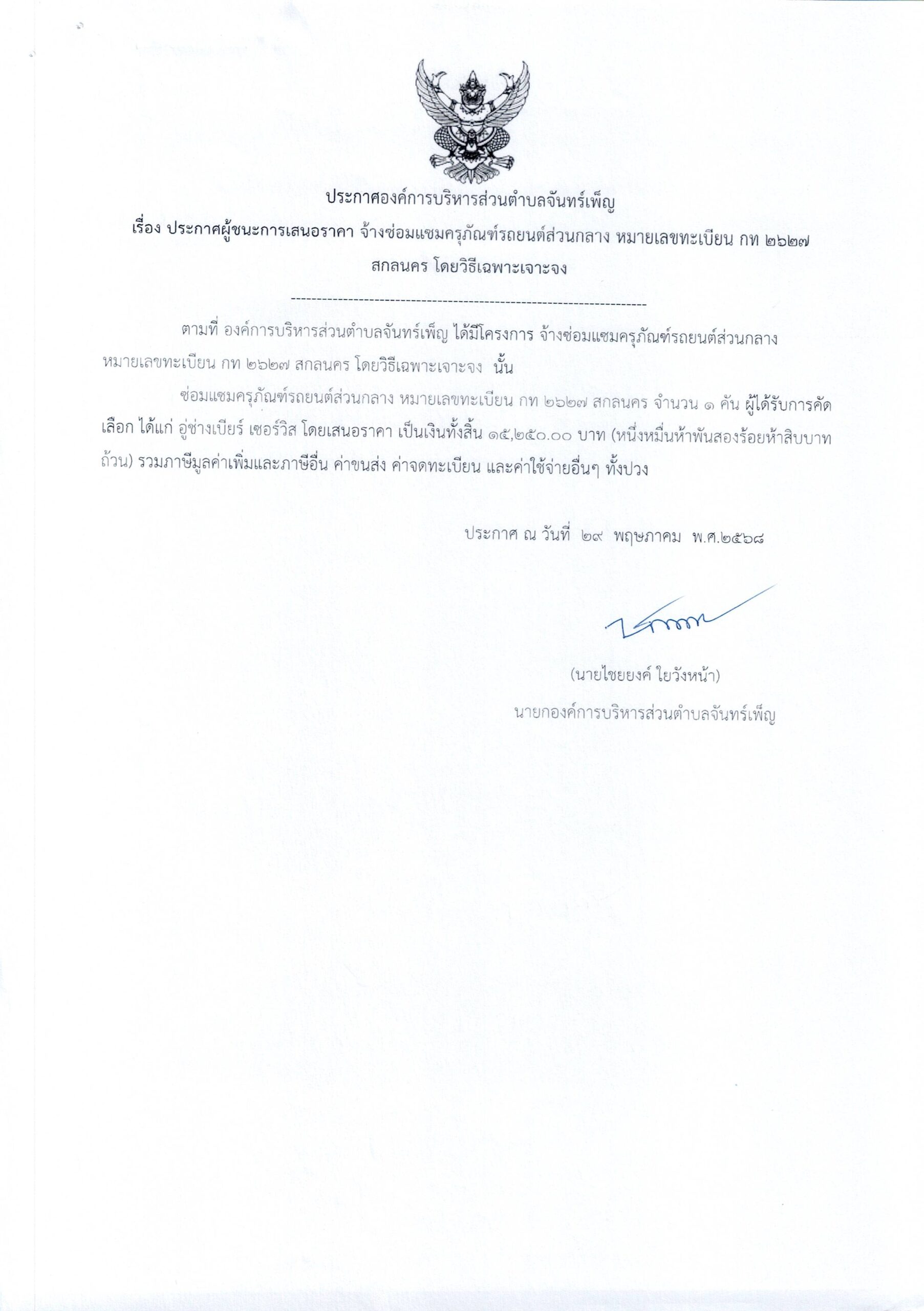 ประกาศ อบต.จันทร์เพ็ญ เรื่อง ประกาศผู้ชนะการเสนอราคา จ้างซ่อมแซมครุภัณฑ์รถยนต์ส่วนกลาง 29 พฤษภาคม 6817 พฤศจิกายน 25อบต. จันทร์เพ็ญประกาศจัดซื้อจัดจ้าง อ่านแล้ว : 5 Facebook iconFacebookTwitter iconTwitterLINE iconLine