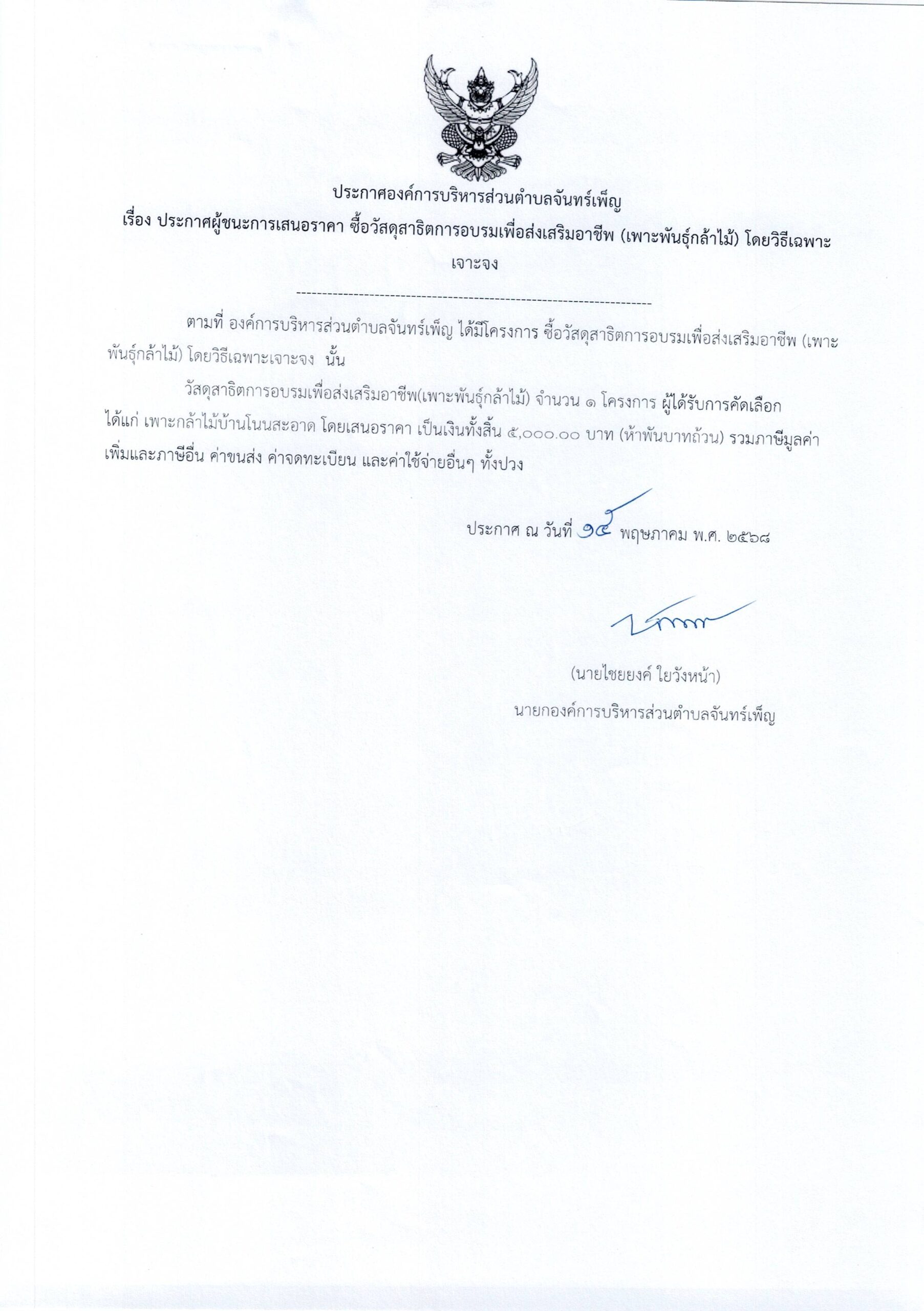 ประกาศ อบต.จันทร์เพ็ญ เรื่อง ประกาศผู้ชนะการเสนอราคา ซื้อวัสดุสาธิตการอบรมเพื่อส่งเสริมอาชีพ (เพราะพันธุ์กล้าไม้) 15 พฤษภาคม 6817 พฤศจิกายน 25อบต. จันทร์เพ็ญประกาศจัดซื้อจัดจ้าง อ่านแล้ว : 5 Facebook iconFacebookTwitter iconTwitterLINE iconLine