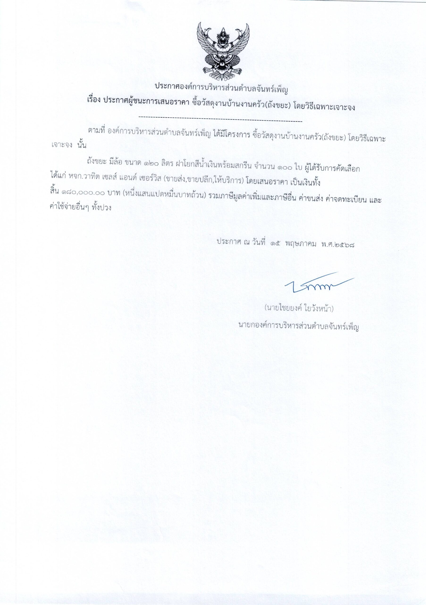 ประกาศ อบต. จันทร์เพ็ญ เรื่อง ประกาศผู้ชนะการเสนอราคา ซื้อวัสดุงานบ้านครัว(ถังขยะ) 15 พฤษภาคม 6817 พฤศจิกายน 25อบต. จันทร์เพ็ญประกาศจัดซื้อจัดจ้าง อ่านแล้ว : 5 Facebook iconFacebookTwitter iconTwitterLINE iconLine