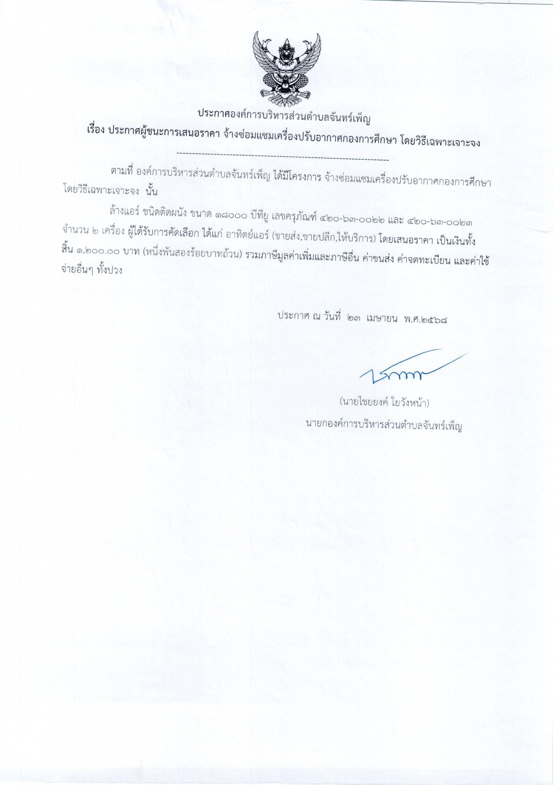 ประกาศ อบต.จันทร์เพ็ญ เรื่อง ประกาศผู้ชนะการเสนอราคา จ้างซ่อมแซมเครื่งปรับอากาศกองการศึกษา 23 เมษายน 6817 พฤศจิกายน 25อบต. จันทร์เพ็ญประกาศจัดซื้อจัดจ้าง อ่านแล้ว : 5 Facebook iconFacebookTwitter iconTwitterLINE iconLine