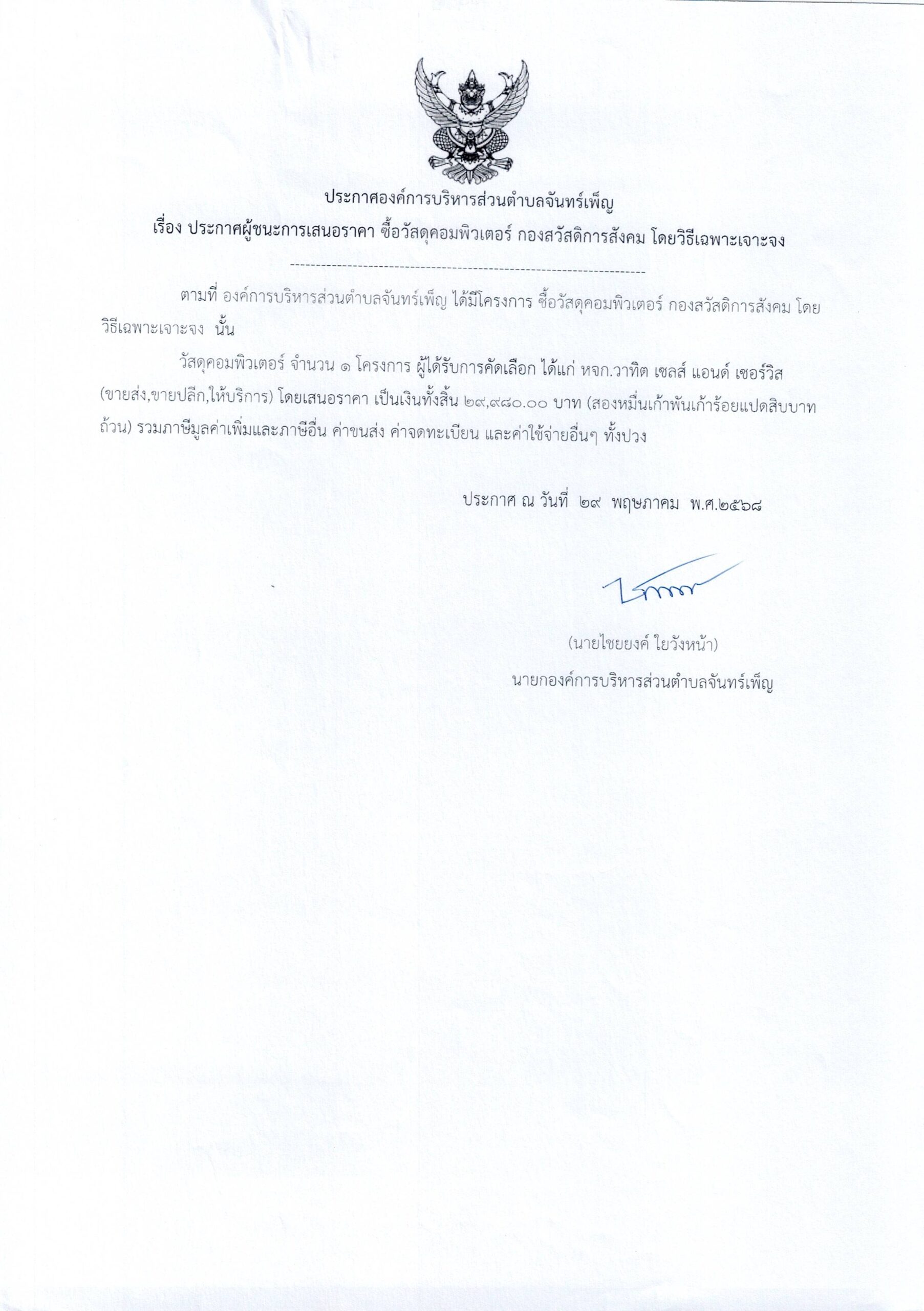 ประกาศ อบต.จันทร์เพ็ญ เรื่อง ประกาศผู้ชนะการเสนอราคา ซื้อวัสดุคอมพิวเตอร์ กองสวัสดิการสังคม 29 พฤษภาคม 6817 พฤศจิกายน 25อบต. จันทร์เพ็ญประกาศจัดซื้อจัดจ้าง อ่านแล้ว : 5 Facebook iconFacebookTwitter iconTwitterLINE iconLine
