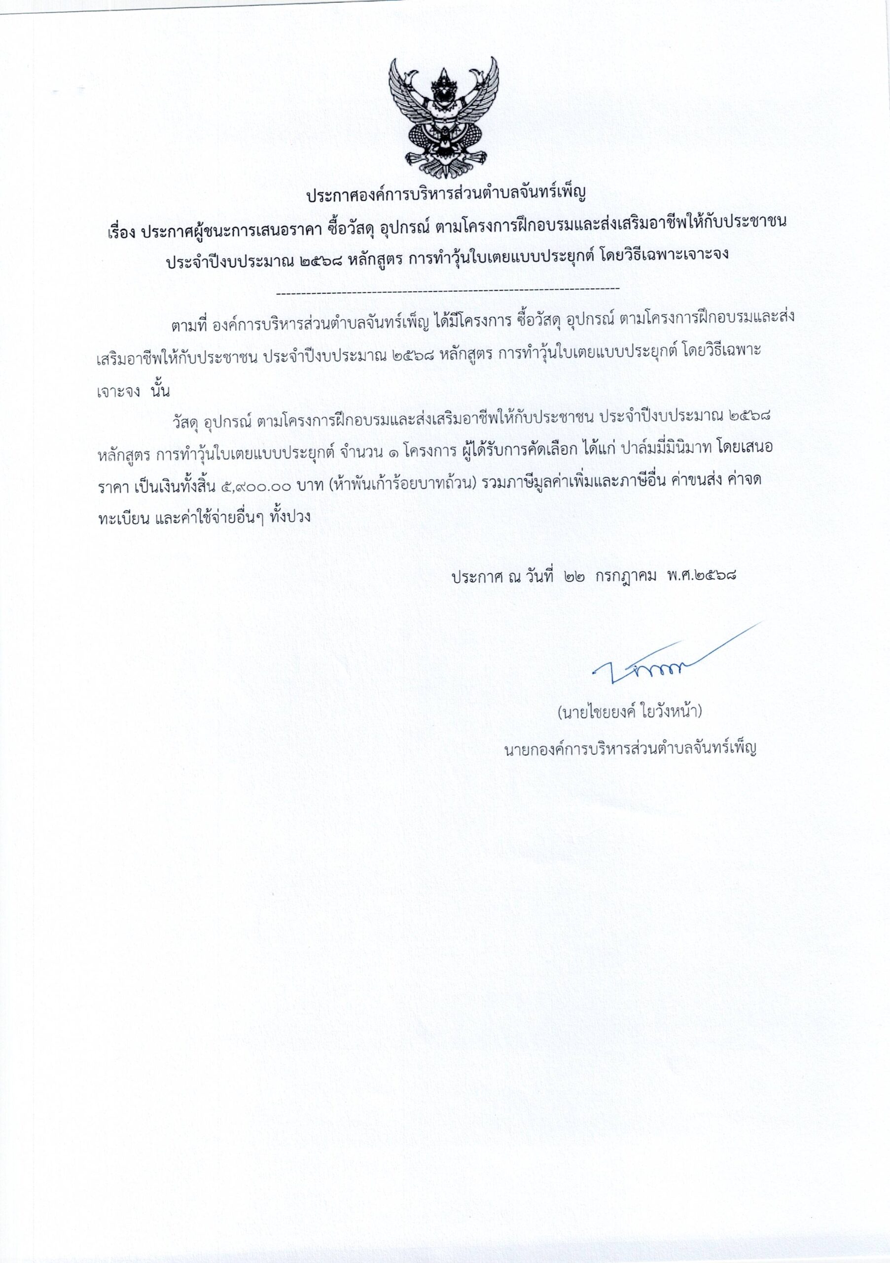 ประกาศ อบต.จันทร์เพ็ญ เรื่อง ประกาศผู้ชนะการเสนอราคา ซื้อวัสดุอุปกรณ์ ตามโครงการฝึกอบรมและส่งเสริมอาชีพให้กับประชาชนประจำปีงบประมาณ ๒๕๖๘ หลักสูตร การทำวุ้นใบเตยแบบประยุกต์ 22 กรกฎาคม 6817 พฤศจิกายน 25อบต. จันทร์เพ็ญประกาศจัดซื้อจัดจ้าง อ่านแล้ว : 6 Facebook iconFacebookTwitter iconTwitterLINE iconLine