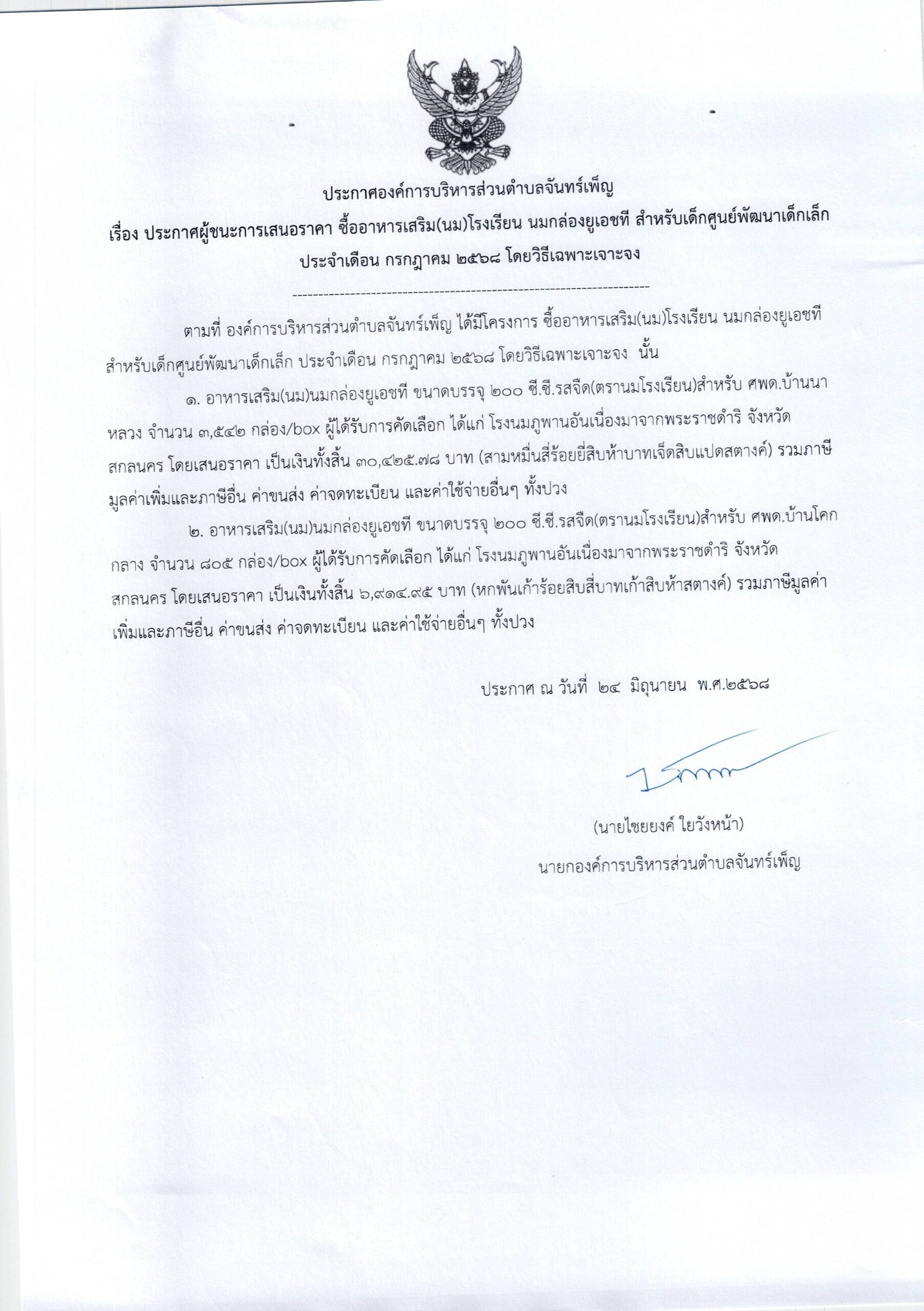 ประกาศ อบต.จันทร์เพ็ญ เรื่อง ประกา่ศผู้ชนะการเสนอราคา ซื้ออาหารเสริม(นม)โรงเรียน นมกล่องยูเอชที สำหรับเด็กศูนย์พัฒนาเด็กเล็ก ประจำเดือน กรกฎาคม ๒๕๖๘ 24 มิถุนายน 6817 พฤศจิกายน 25อบต. จันทร์เพ็ญประกาศจัดซื้อจัดจ้าง อ่านแล้ว : 5 Facebook iconFacebookTwitter iconTwitterLINE iconLine