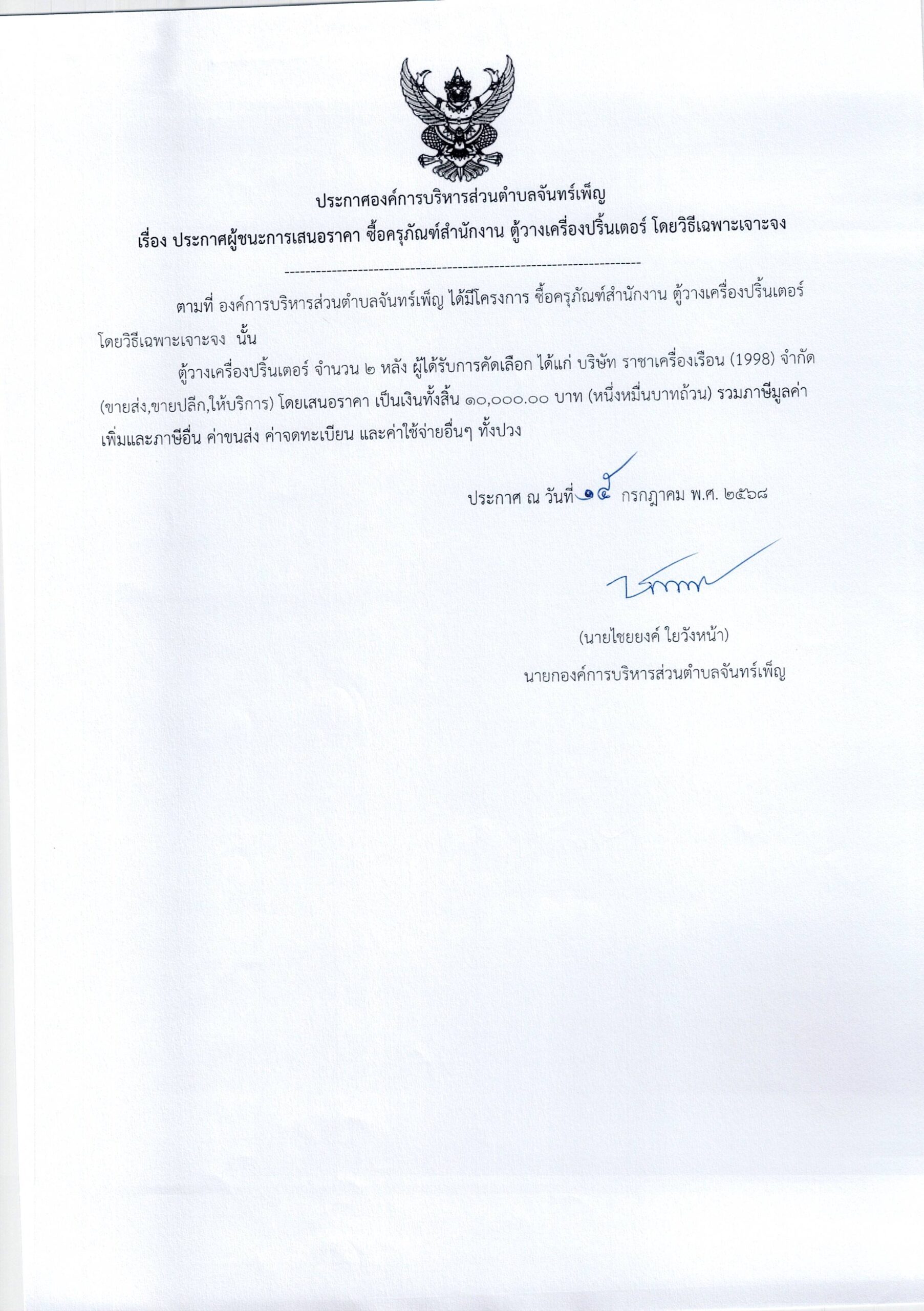 ปะกาศ อบต.จันทร์เพ็ญ เรื่อง ประกาศผู้ชนะการเสนอราคา ซื้อครุภัณฑ์สำนักงาน ตู้วางเครื่องปริ้นเตอร์ 15 กรกฎาคม 6817 พฤศจิกายน 25อบต. จันทร์เพ็ญประกาศจัดซื้อจัดจ้าง อ่านแล้ว : 5 Facebook iconFacebookTwitter iconTwitterLINE iconLine
