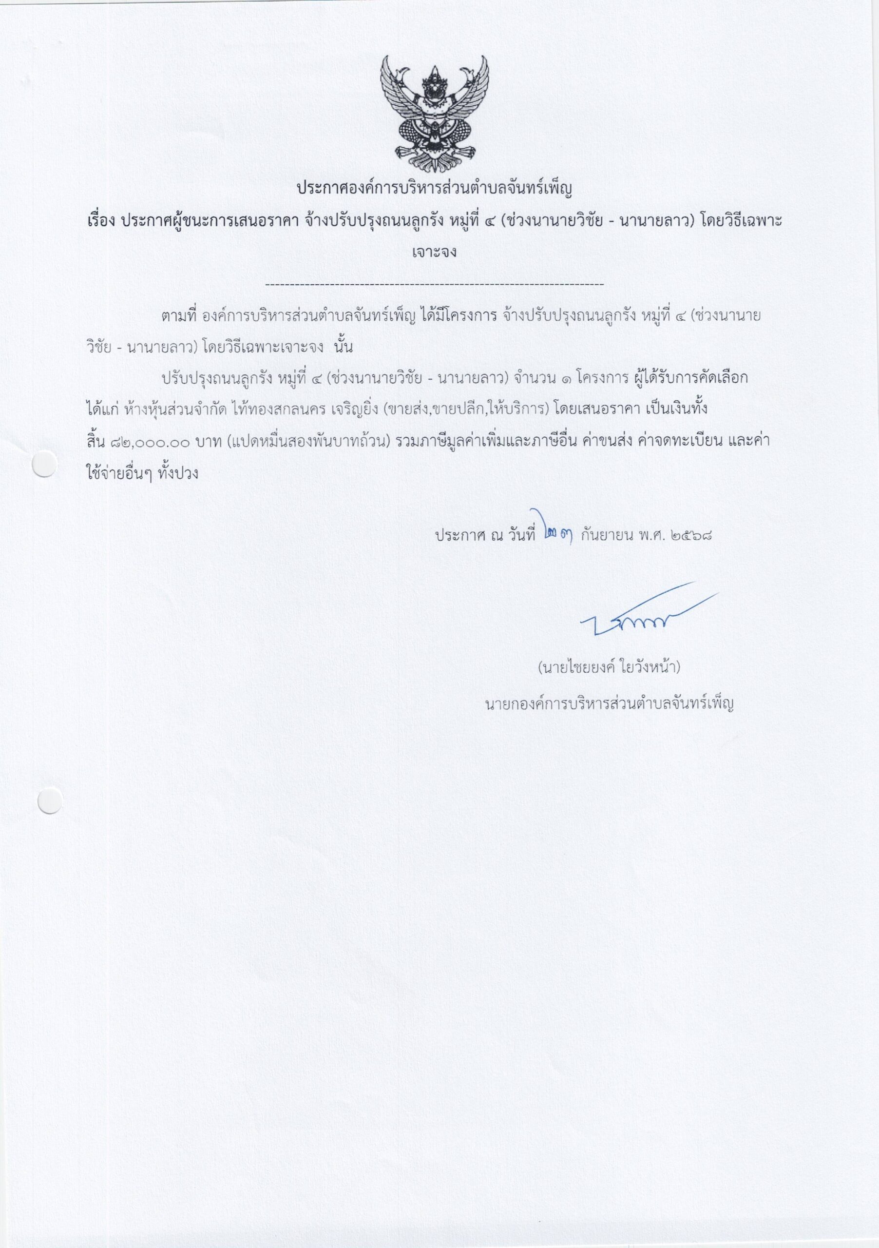 ประกาศ อบต.จันทร์เพ็ญ เรื่อง ประกาศผู้ชนะการเสนอราคา จ้างปรับปรุงถนนลูกรัง หมู่ที่ ๔ (ช่างนานายวิชัย – นานายลาว) โดยวิธีเฉพาะเจาะจง 23 กันยายน 689 ธันวาคม 25อบต. จันทร์เพ็ญประกาศจัดซื้อจัดจ้าง อ่านแล้ว : 1 Facebook iconFacebookTwitter iconTwitterLINE iconLine