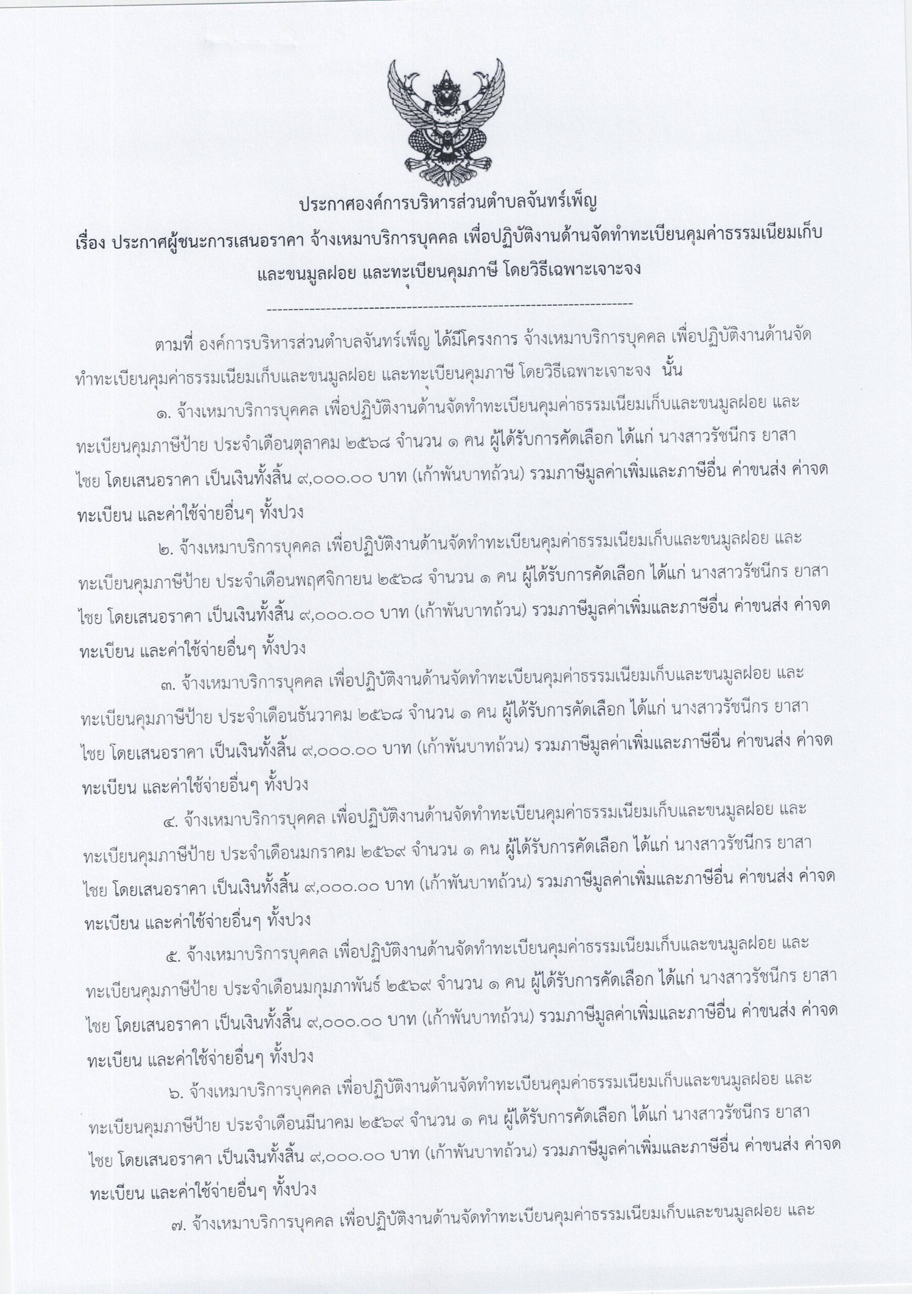 ประกาศ อบต.จันทร์เพ็ญ เรื่อง ประกาศผู้ชนะการเสนอราคา จ้างเหมาบริการบุคคล เพื่อปฏิบัติงานด้านจัดทำทะเบียนคุมค่าธรรมเนียมเก็บและขนมูลฝอย และทะเบียนคุมภาษี โดยวิธีเฉพาะเจาะจง 25 กันยายน 689 ธันวาคม 25อบต. จันทร์เพ็ญประกาศจัดซื้อจัดจ้าง อ่านแล้ว : 1 Facebook iconFacebookTwitter iconTwitterLINE iconLine