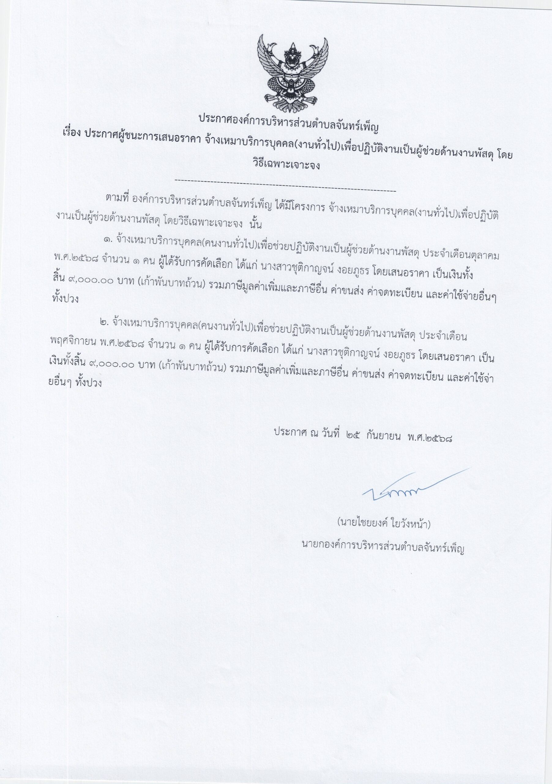 ประกาศ อบต.จันทร์เพ็ญ เรื่อง ประกาศผู้ชนะการเสนอราคา จ้างเหมาบริการบุคคล(งานทั่วไป)เพื่อปฏิบัติงานเป็นผู้ช่วยด้านงานพัสดุ โดยวิธีเฉพาะเจาะจง 25 กันยายน 689 ธันวาคม 25อบต. จันทร์เพ็ญประกาศจัดซื้อจัดจ้าง อ่านแล้ว : 1 Facebook iconFacebookTwitter iconTwitterLINE iconLine
