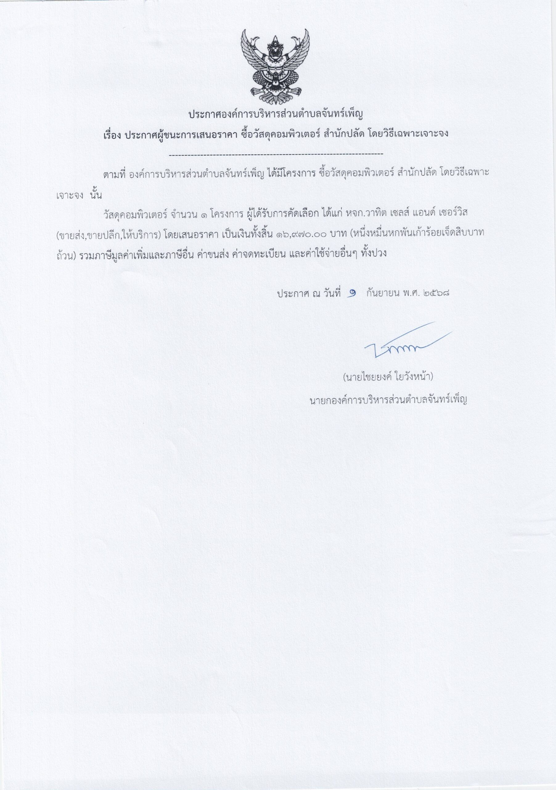 ประกาศ อบต.จันทร์เพ็ญ เรื่อง ประกาศผู้ชนะการเสนอราคา ซื้อวัสดุคอมพิวเตอร์ สำนักปลัด โดยวิธีเฉพาะเจาะจง 1 กันยายน 689 ธันวาคม 25อบต. จันทร์เพ็ญประกาศจัดซื้อจัดจ้าง อ่านแล้ว : 1 Facebook iconFacebookTwitter iconTwitterLINE iconLine
