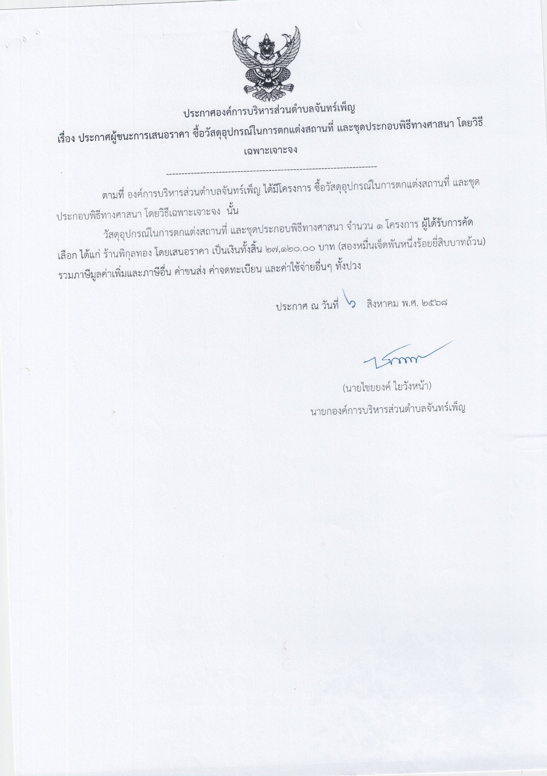 ประกาศ อบต.จันทร์เพ็ญ เรื่อง ประกาศผู้ชนะการเสนอราคาซื้อวัสดุอุปกรณ์ในการตกแต่งสถานที่ และชุดประกอบพิธืทางศาสนา โดยวิธีเฉพาะเจาะจง 6 สิงหาคม 689 ธันวาคม 25อบต. จันทร์เพ็ญประกาศจัดซื้อจัดจ้าง อ่านแล้ว : 1 Facebook iconFacebookTwitter iconTwitterLINE iconLine