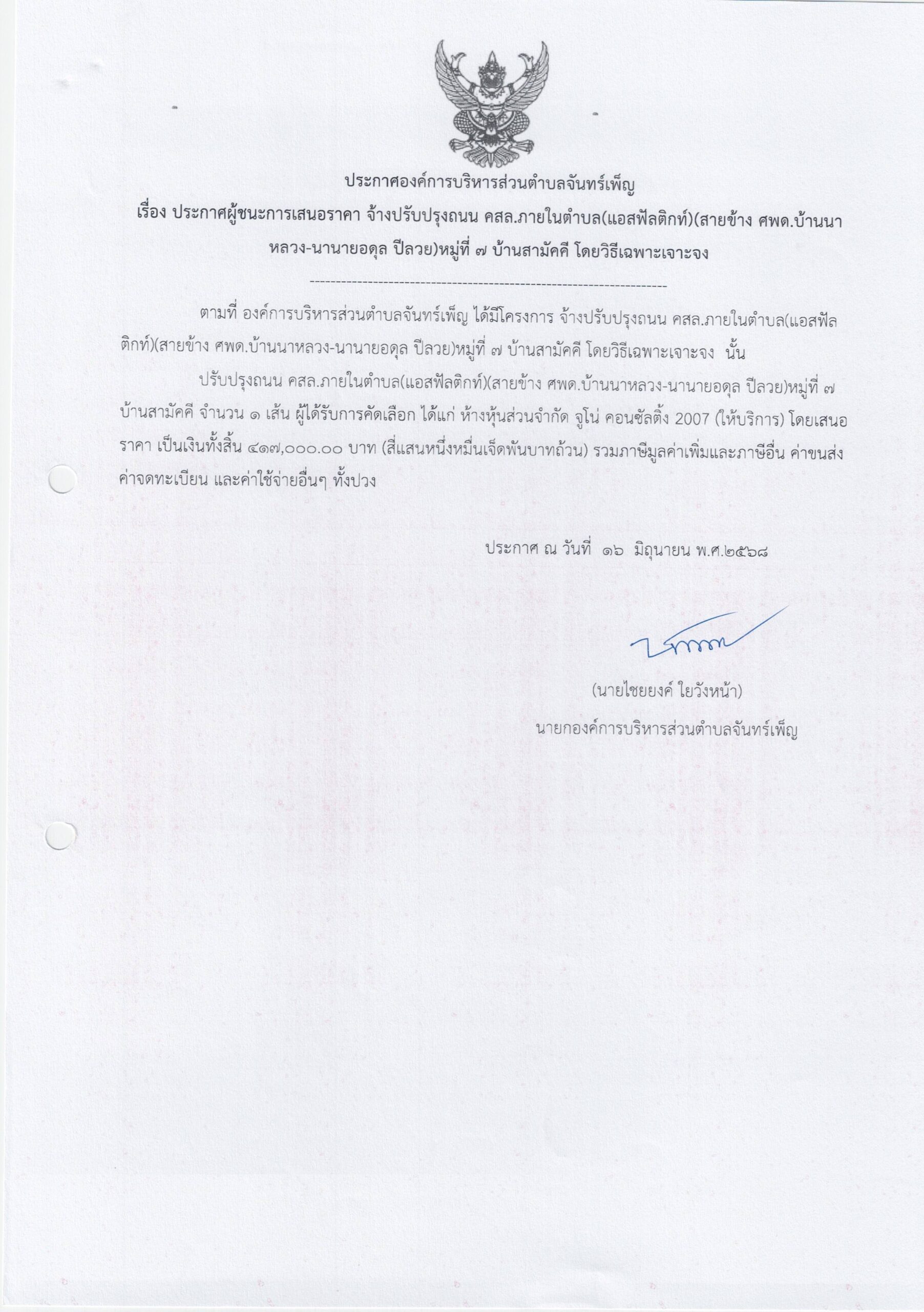 ประกาศ อบต.จันทร์เพ็ญ เรื่อง ประกาศผู้ชนะการเสนอราคา จ้างปรับปรุงถนน คลส.ภายในตำบล(แอสฟิลท์ติก)(สายข้าง ศพด.บ้านนาหลวง-นานายอดุล ปีลวย) หมู๋ที่๗ บ้านสามัคคี โดยวิธีเฉพาะเจาะจง 16 มิถุนายน 689 ธันวาคม 25อบต. จันทร์เพ็ญประกาศจัดซื้อจัดจ้าง อ่านแล้ว : 7 Facebook iconFacebookTwitter iconTwitterLINE iconLine