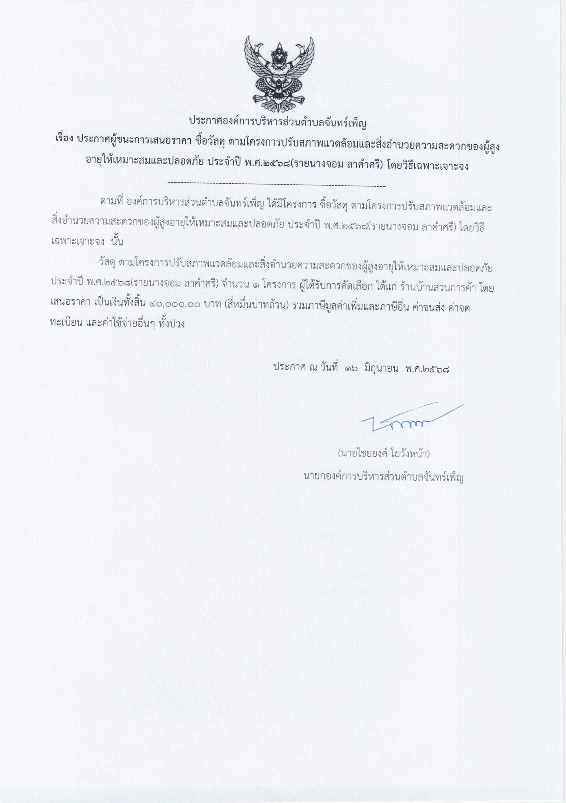 ประกาศ อบต.จันทร์เพ็ญ เรื่อง ประกาศผู้ชนะการเสนอราคา ซื้อวัสดุ ตามโครงการปรับสภาพแวดล้อมและสิ่งอำนวยความสะดวกของผู้สูงอายุให้เหมาะสมและปลอดภัย ประจำปี พ.ศ.๒๕๖๘(รายนางจอม ลาคำศรี) โดยวิธีเฉพาะเจาะจง 16 มิถุนายน 689 ธันวาคม 25อบต. จันทร์เพ็ญประกาศจัดซื้อจัดจ้าง อ่านแล้ว : 6 Facebook iconFacebookTwitter iconTwitterLINE iconLine