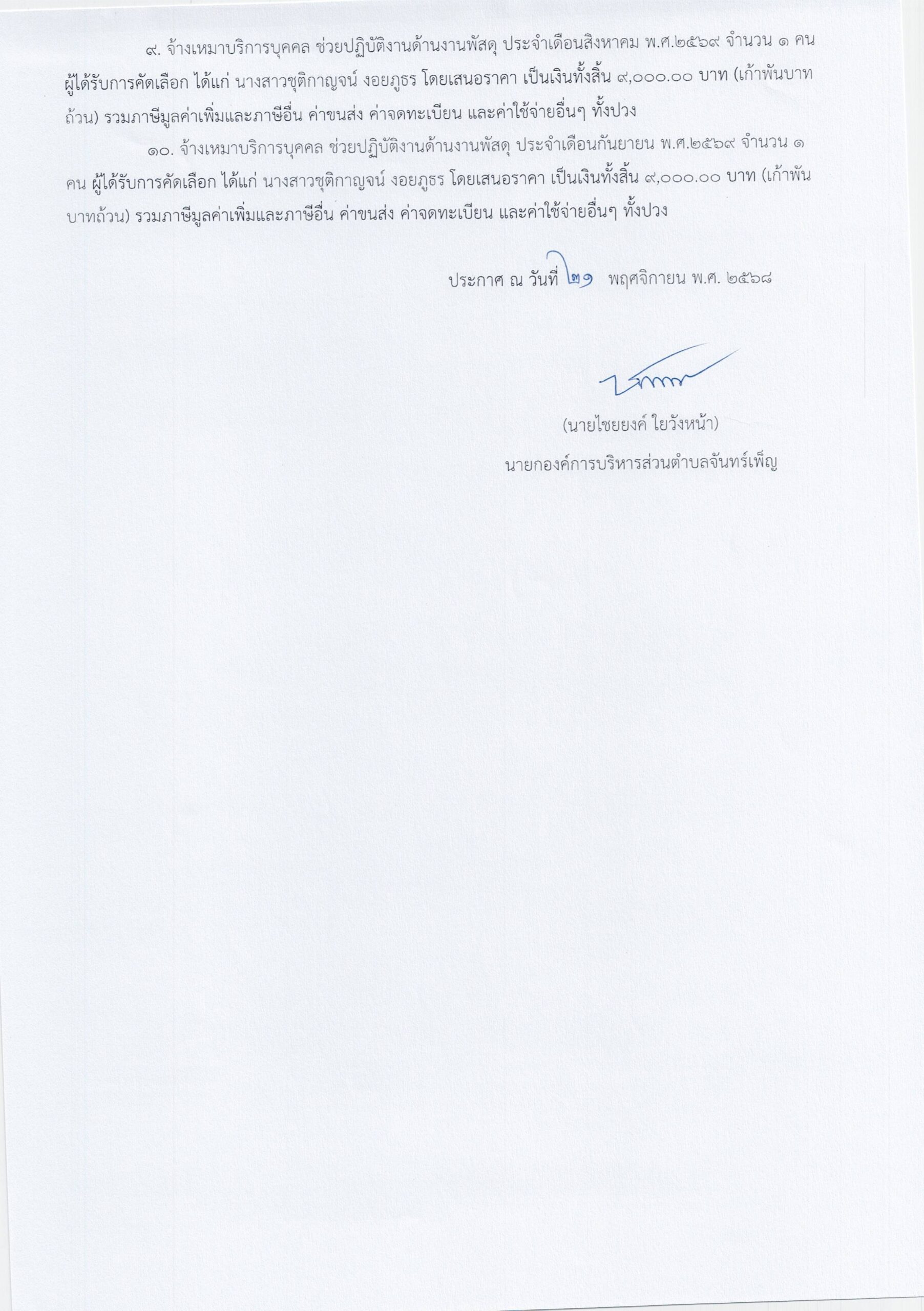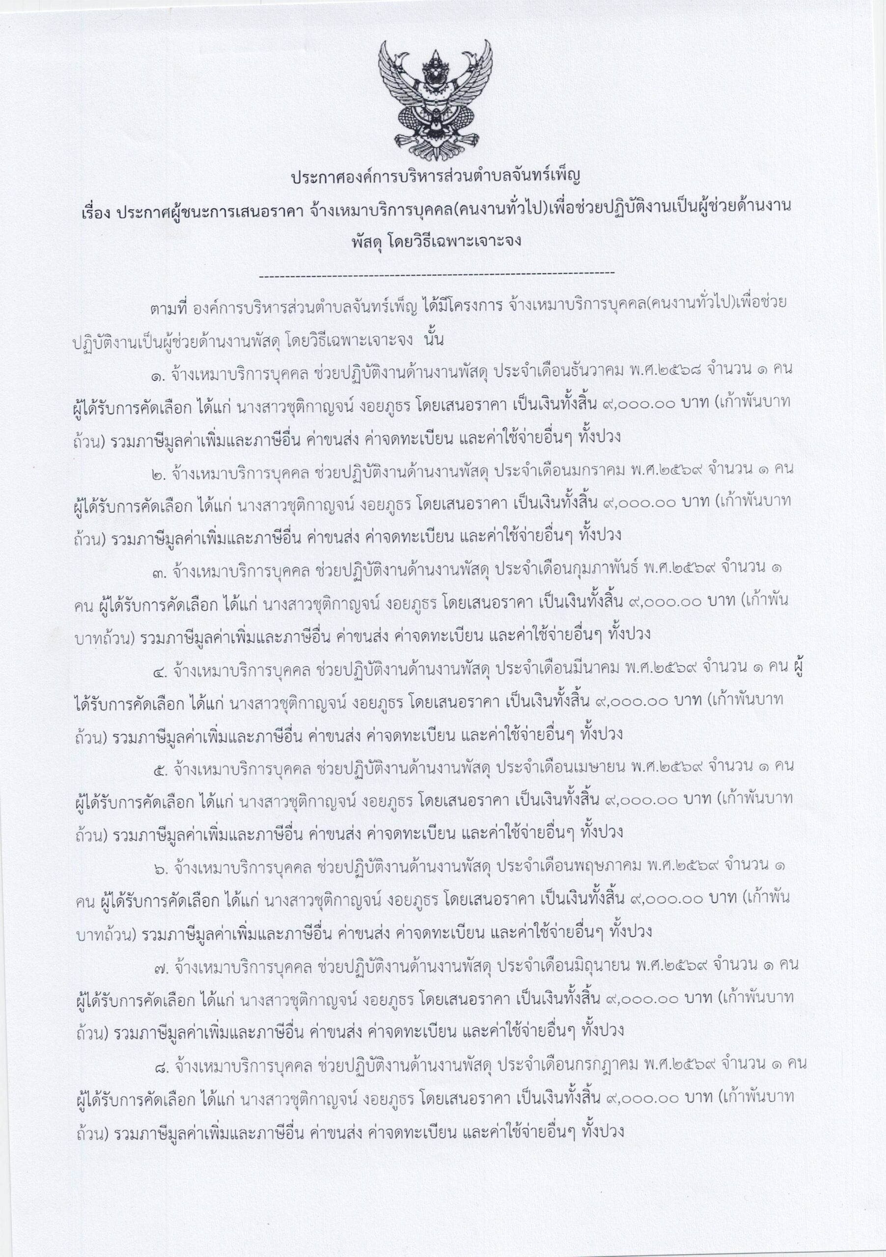 ประกาศ อบต.จันทร์เพ็ญ เรื่อง ประกาศผู้ชนะการเสนอราคา จ้างเหมาบริการบุคคล(คนงานทั่วไป)เพื่อช่วยปฏิบัติงานเป็นผู้ช่วยด้านงานพัสดุ 21 พฤศจิกายน 6813 มกราคม 26อบต. จันทร์เพ็ญประกาศจัดซื้อจัดจ้าง อ่านแล้ว : 29 Facebook iconFacebookTwitter iconTwitterLINE iconLine