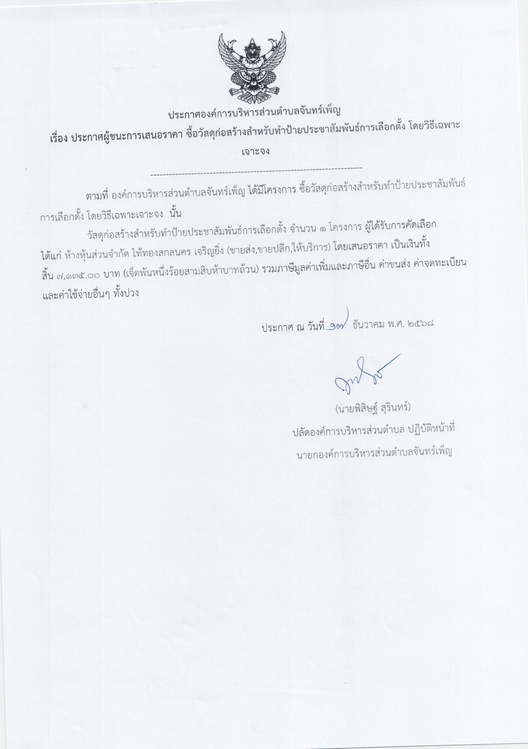 ประกาศ อบต.จันทร์เพ็ญ เรื่อง ประกาศผู้ชนะการเสนอรา ซื้อวัสดุก่อสร้างสำหรับทำป้ายประชาสัมพันธ์การเลือกตั้ง 17 ธันวาคม 6813 มกราคม 26อบต. จันทร์เพ็ญประกาศจัดซื้อจัดจ้าง อ่านแล้ว : 37 Facebook iconFacebookTwitter iconTwitterLINE iconLine