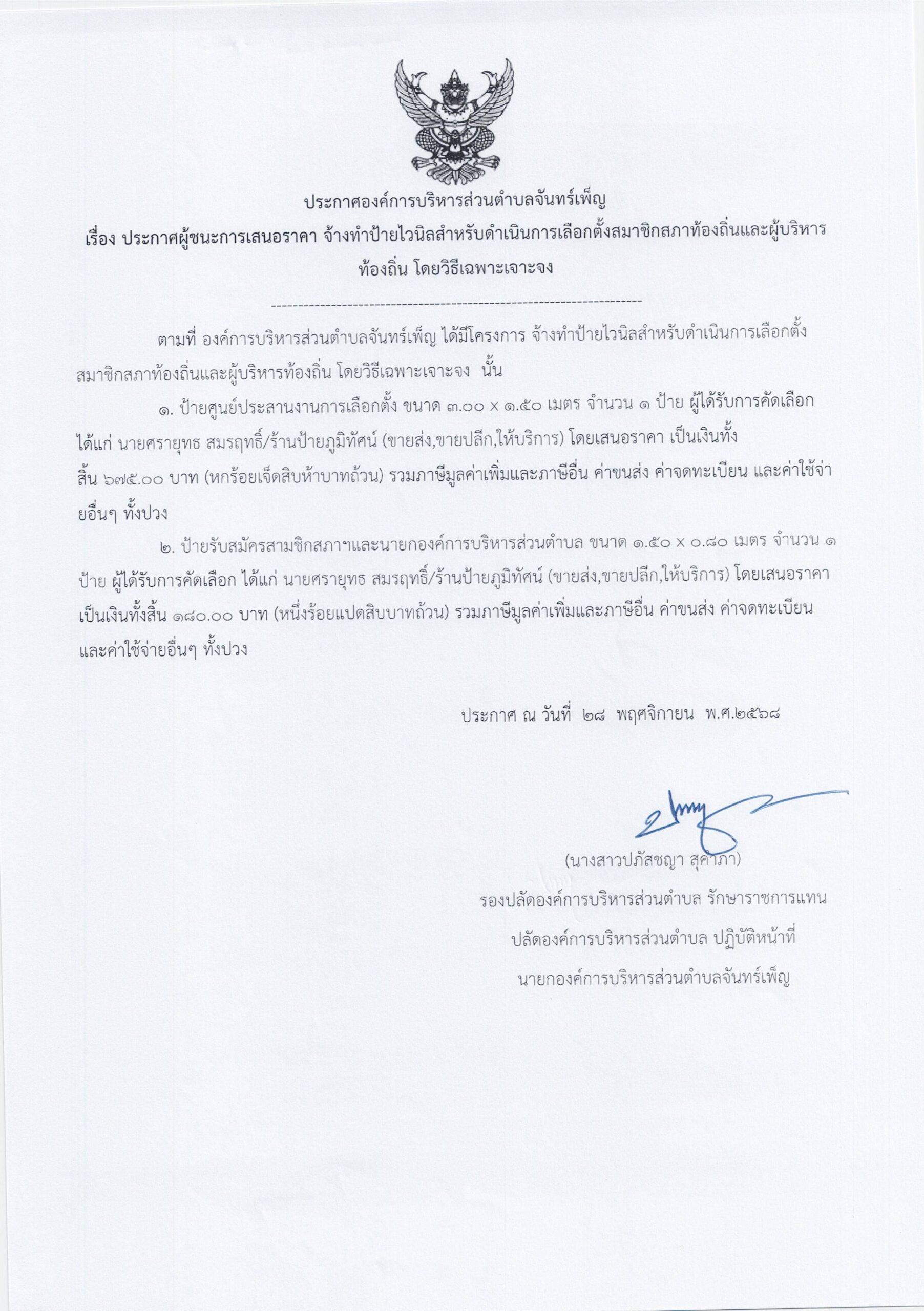 ประกาศ อบต.จันทร์เพ็ญ เรื่อง ประกาศผู้ชนะการเสนอราคา จ้างทำป้ายไวนิลสำหรับดำเนินการเลือกตั้งสมาชิกสภาท้องถิ่นและผู้บริหารท้องถิ่น 28 พฤศจิกายน 6813 มกราคม 26อบต. จันทร์เพ็ญประกาศจัดซื้อจัดจ้าง อ่านแล้ว : 39 Facebook iconFacebookTwitter iconTwitterLINE iconLine