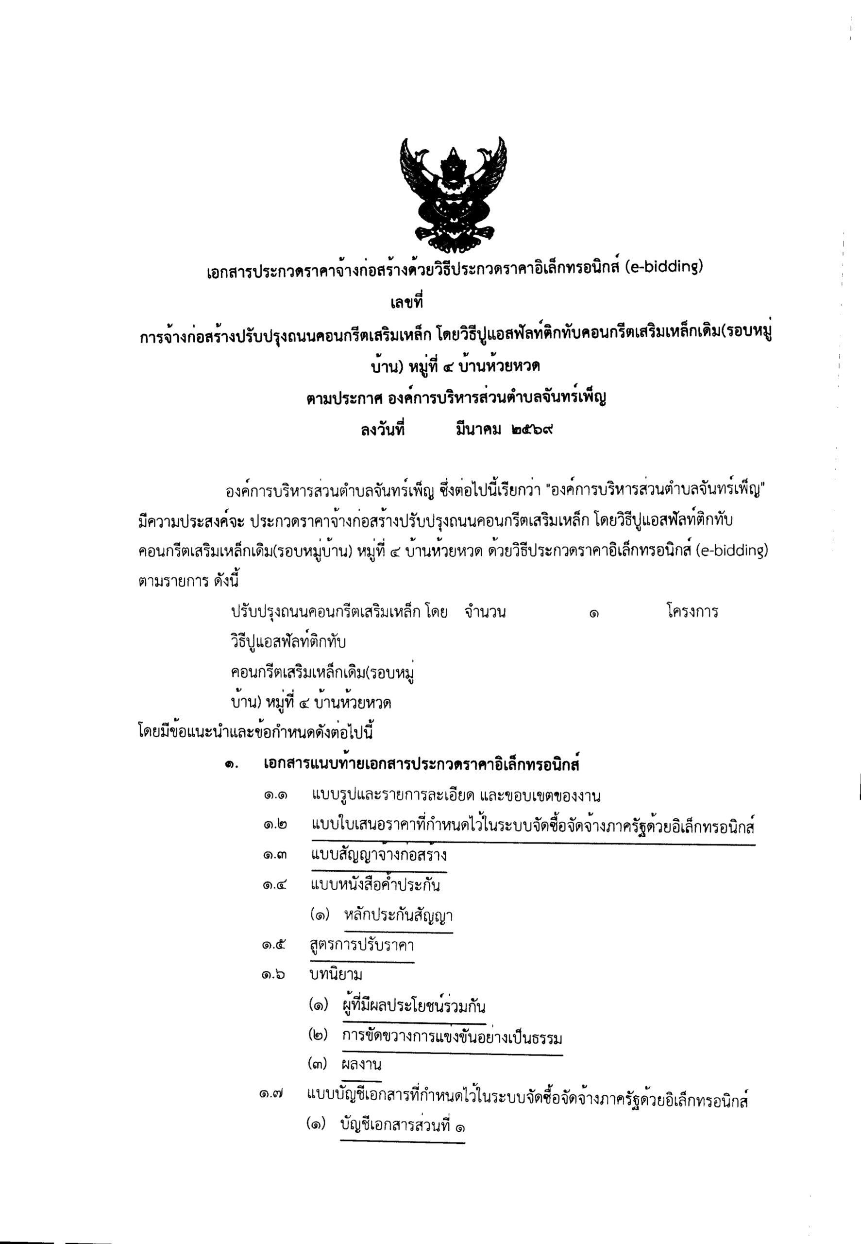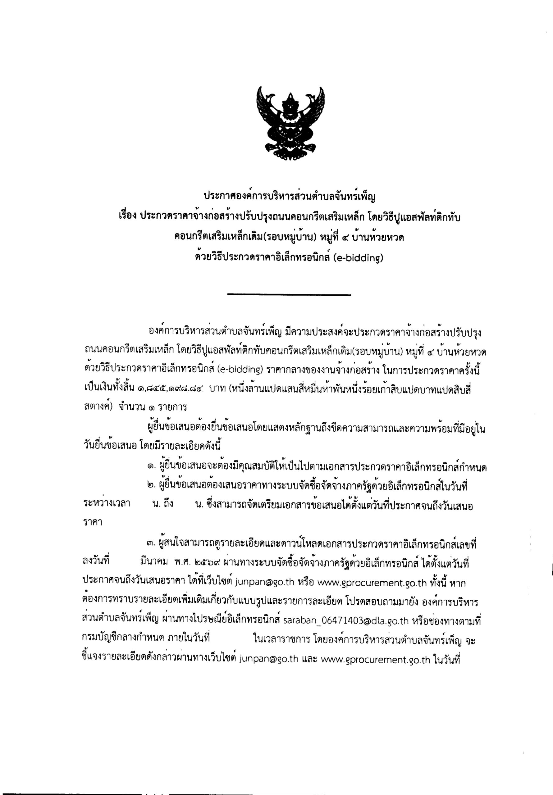 ประกาศ อบต.จันทร์เพ็ญ เรื่องประกวดราคาจ้างก่อสร้างปรับปรุงถนนคอนกรีตเสริมเหล็ก โดยวิธีปูแอสฟัลท์ติกทับคอนกรีตเสริมเหล็กเดิม (รอบหมู่บ้าน) หมู่ที่ บ้านห้วยหวด ด้วยวิธีประกวดราคาอิเล็กทรอนิกส์ (E-bidding)) 24 มีนาคม 6925 มีนาคม 26อบต. จันทร์เพ็ญประกาศจัดซื้อจัดจ้าง Loading... Taking too long? Reload document | Open in new tab ดาวน์โหลดเอกสาร.. อ่านแล้ว : 24 Facebook iconFacebookTwitter iconTwitterLINE iconLine