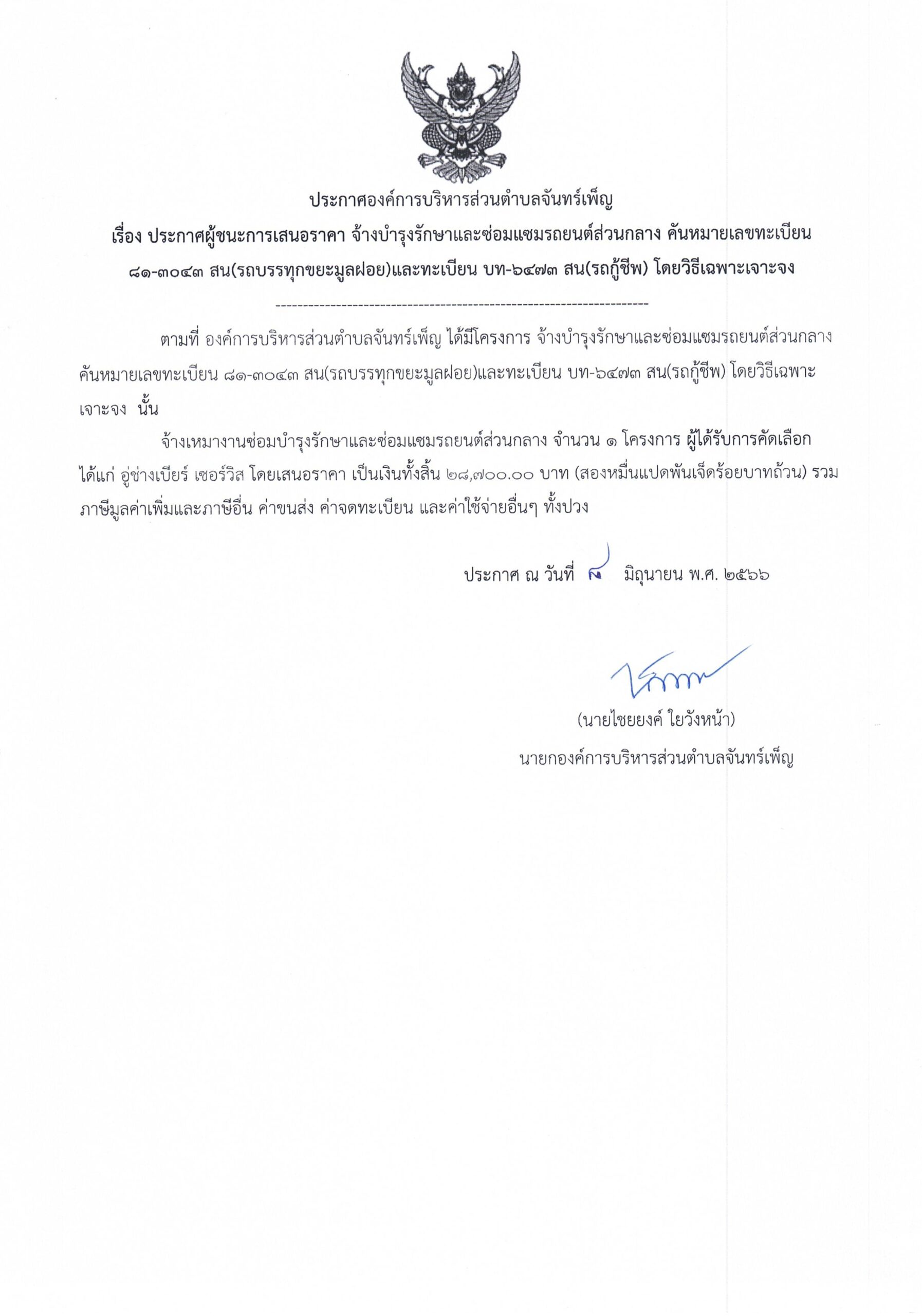 ประกาศ อบต.จันทร์เพ็ญ เรื่อง ประกาศผู้ชนะการเสนอราคา จ้างบำรุงรักษาและซ่อมแซมรถยนต์ส่วนกลาง คันหมายเลขทะเบียน 81-3043 สน และทะเบียน บท -6473 สน 6 กรกฎาคม 666 กรกฎาคม 23อบต. จันทร์เพ็ญประกาศจัดซื้อจัดจ้าง ประกาศ อบต.จันทร์เพ็ญ เรื่อง ประกาศผู้ชนะการเสนอราคา อ่านแล้ว : 191 Facebook iconFacebookTwitter iconTwitterLINE iconLine