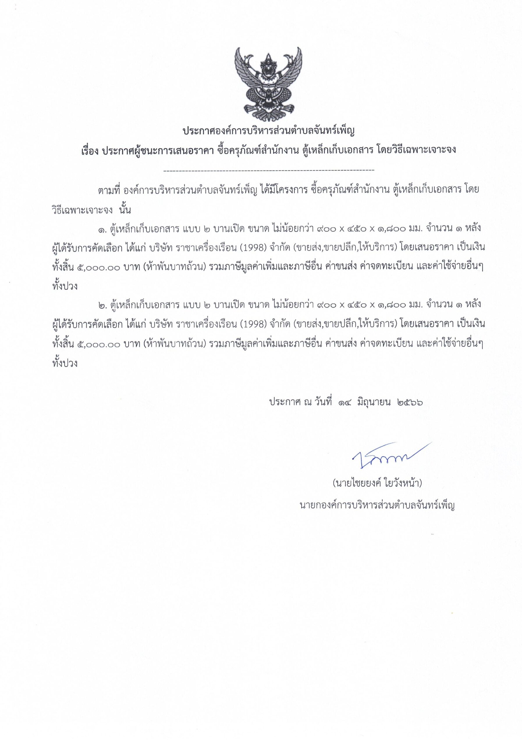ประกาศผู้ชนะการเสนอราคา ซื้อครุภัณฑ์สำนักงาน ตู้เหล็กเก็บเอกสาร 17 กรกฎาคม 66อบต. จันทร์เพ็ญประกาศจัดซื้อจัดจ้าง อ่านแล้ว : 173 Facebook iconFacebookTwitter iconTwitterLINE iconLine