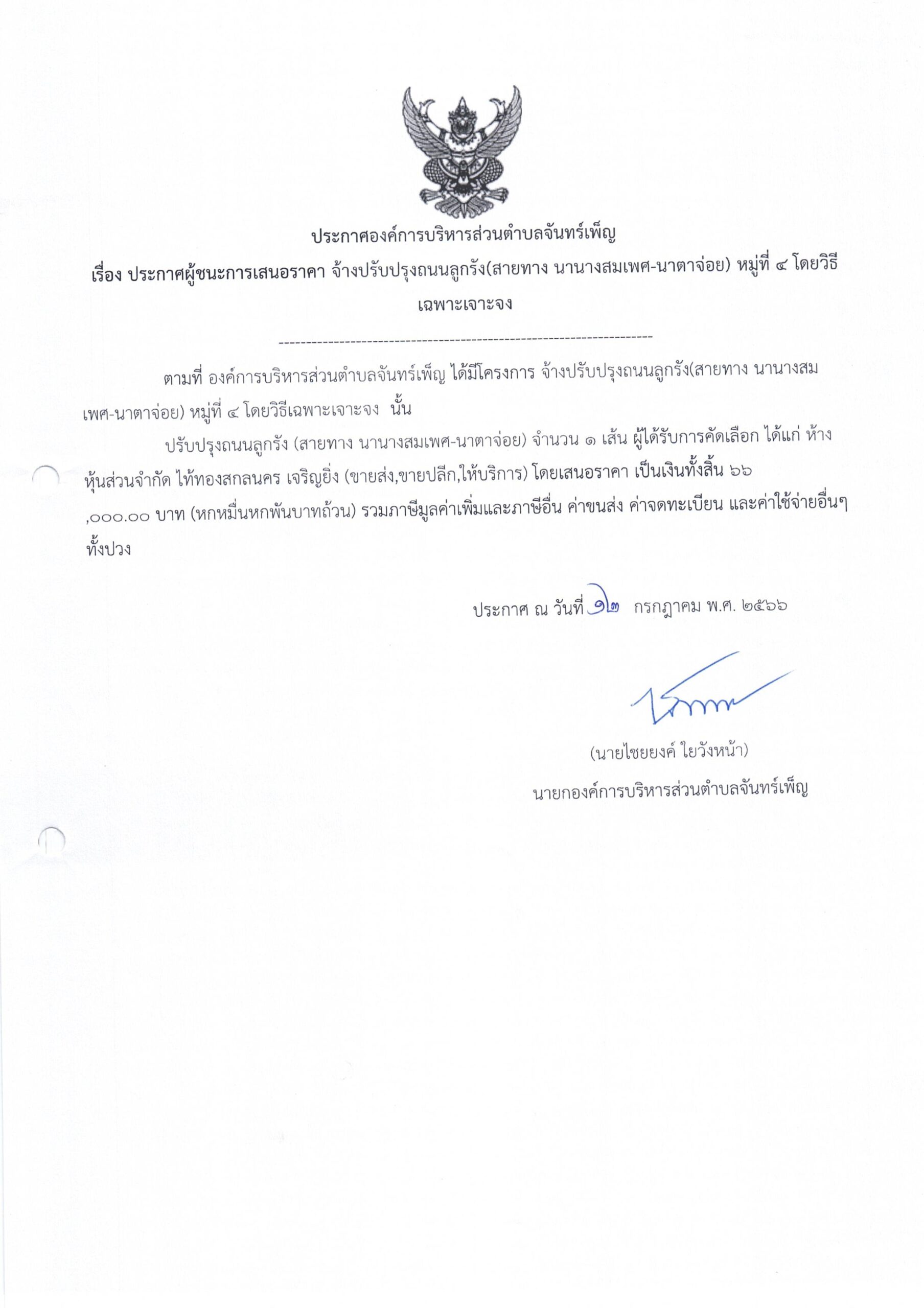 ประกาศ อบต.จันทร์เพ็ญ เรื่องประกาศผู้ชนะการเสนอ จ้างปรับปรุงถนนลูกรัง (สายทาง นานางสมเพศ – นาตาจ่อย) หมู่ที่ 4 12 กรกฎาคม 6619 มกราคม 24อบต. จันทร์เพ็ญประกาศจัดซื้อจัดจ้าง อ่านแล้ว : 157 Facebook iconFacebookTwitter iconTwitterLINE iconLine