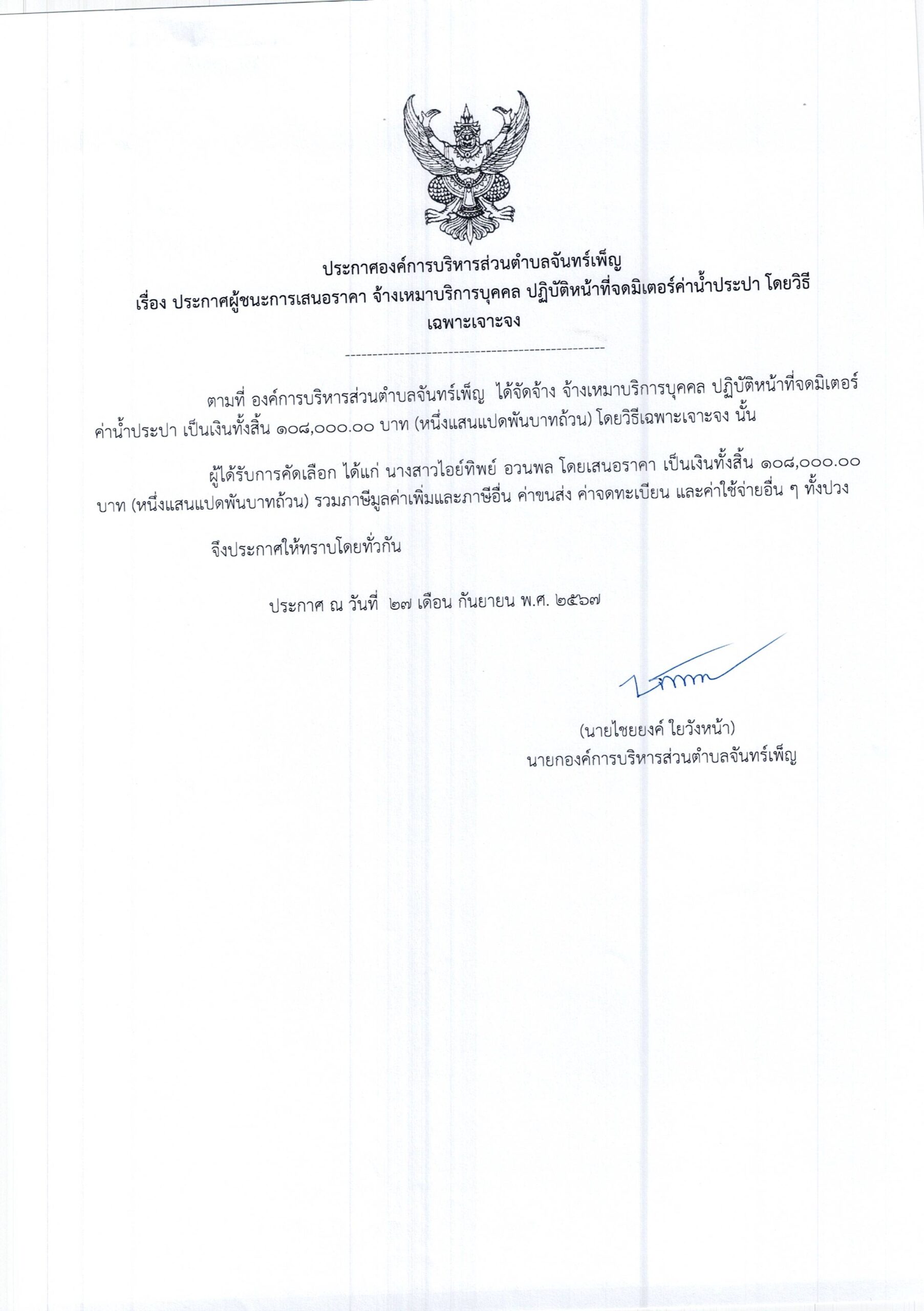 ประกาศผู้ชนะการเสนอราคา จ้างเหมาบริการบุคคล ปฎิบัติหน้าที่จดมิเตอร์ค่าน้ำประปา 27 กันยายน 6618 มีนาคม 25อบต. จันทร์เพ็ญประกาศจัดซื้อจัดจ้าง อ่านแล้ว : 61 Facebook iconFacebookTwitter iconTwitterLINE iconLine